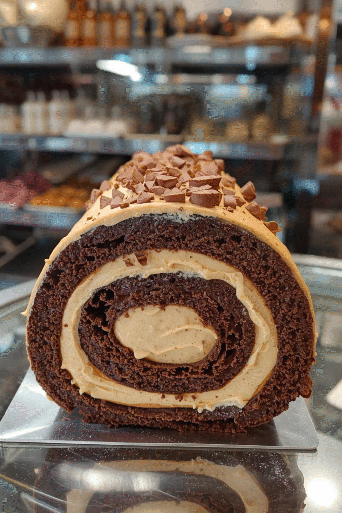 This cake combines a light chocolate sponge with a smooth peanut butter cup–inspired filling, all rolled into a beautiful swirl and coated with glossy chocolate ganache. It looks fancy, tastes incredible, and surprisingly—it’s totally doable at home.